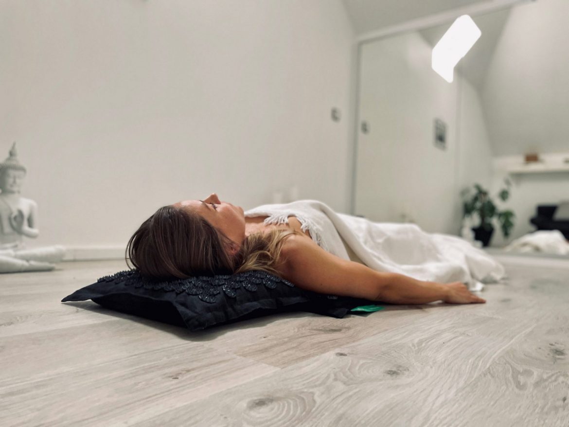 Und zwar nackt (obenrum), mit einer Decke zugedeckt, für 20-30 Minuten. Ich empfehle nicht, die Session zu verkürzen, weil die tiefe Entspannung erst nach 15 Minuten einsetzt. In den ersten 10 Minuten fühlt sich der Kontakt mit den Akupressurpunkten sehr intensiv und vielleicht sogar etwas schmerzhaft an, da der Körper ja quasi auf Nadeln liegt und sich zunächst anpassen muss – aber nach dieser Anfangsphase, in der ich vor allem die Konzentration auf eine regelmäßige, tiefe Atmung empfehle, durch welche Widerstand und Verkrampfung vermieden werden, setzt die effektive und therapeutische Massage ein. Der Rücken wird warm und das ganzheitliche Entspannen deutlich. Hier müssen wir nur noch eins: Genießen und loslassen – psychisch sowie physisch.